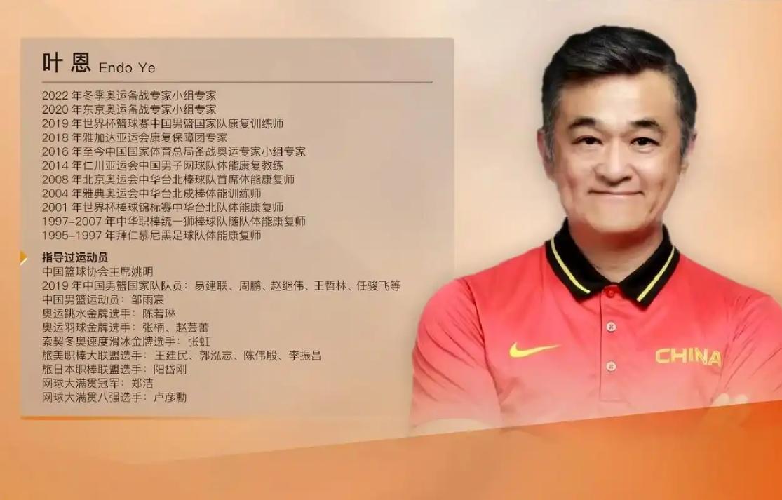对于叶恩,很多球迷还是非常熟悉的,他是中国最顶级的训练师和康复师之一曾经是中国男篮教练组的一员,担任过国家队的首席训练师和康复师。在加盟中国男篮之前,叶恩还曾经担任过德甲拜仁慕尼黑球队的运动理疗师,长期担任网球运动员卢彦勋和奥运冠军郑洁的专属体能教练。在2017年的时候,叶恩加盟了中国男篮红队,负责运动员康复训练工作,并随队参与国际赛事保障,专业能力得到了球员们的一致好评。